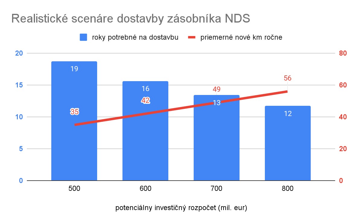 Čo by to znamenalo z hľadiska času potrebného na dostavbu celej siete? Ak by sme ako štát boli schopní dávať na nové projekty pravidelne optimistických 800 miliónov ročne, postavili by sme sieť už za 12 rokov, čo sú len tri volebné obdobia, ľahko uchopiteľný časový rámec. V prípade konsolidačných 500 miliónov ročne by to trvalo asi 19 rokov. To je dlhší čas, ale výrazne lepšie ako pôvodných 27 rokov.